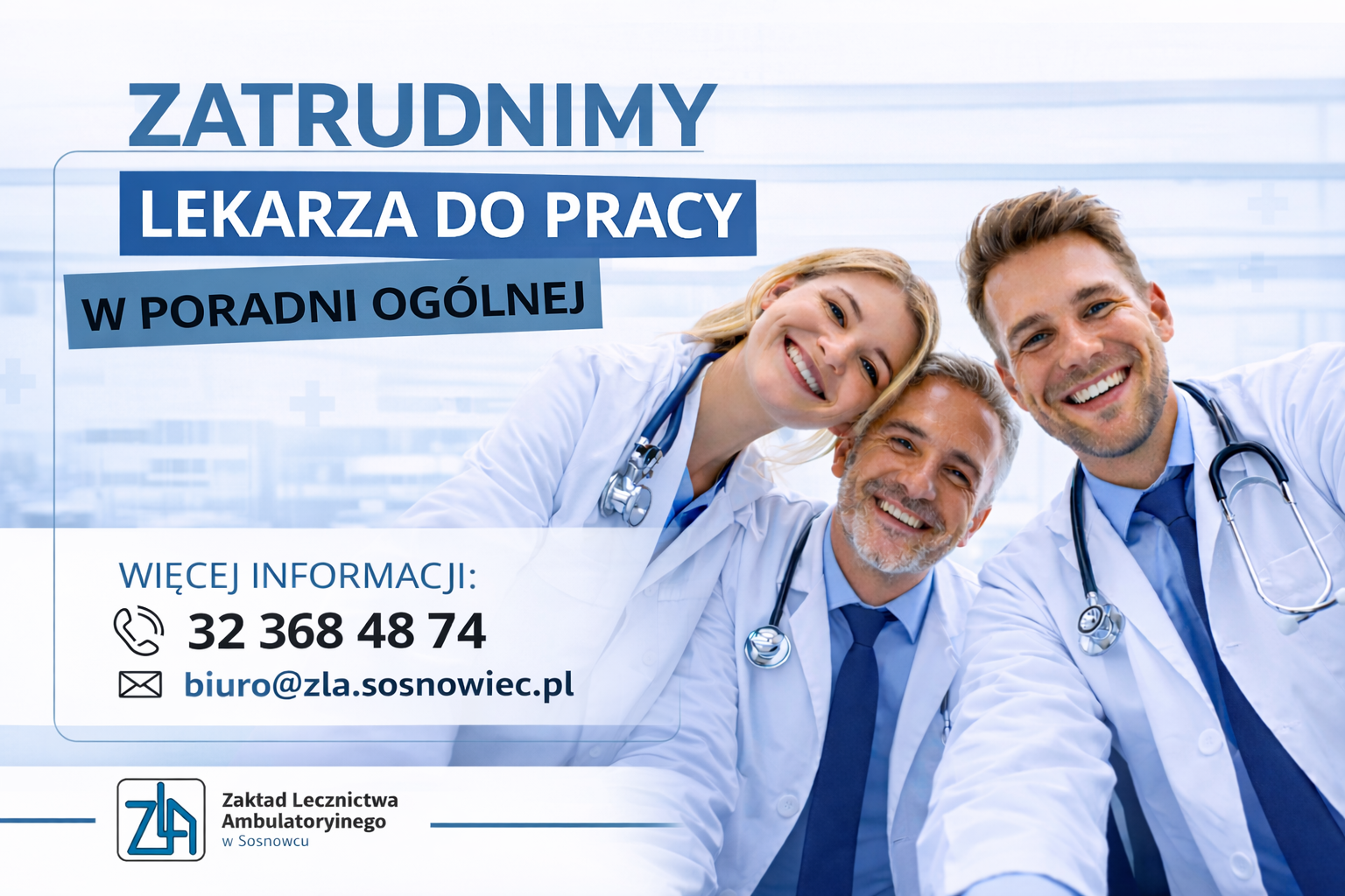 Zakład Lecznictwa Ambulatoryjnego w Sosnowcu zatrudni lekarza na stanowisko w Poradni Ogólnej. Chętnie podejmiemy długofalową współpracę w przyjaznym i dobrze zorganizowanym zespole. Zapraszam do kontaktu osoby zainteresowane pracą w ZLA.