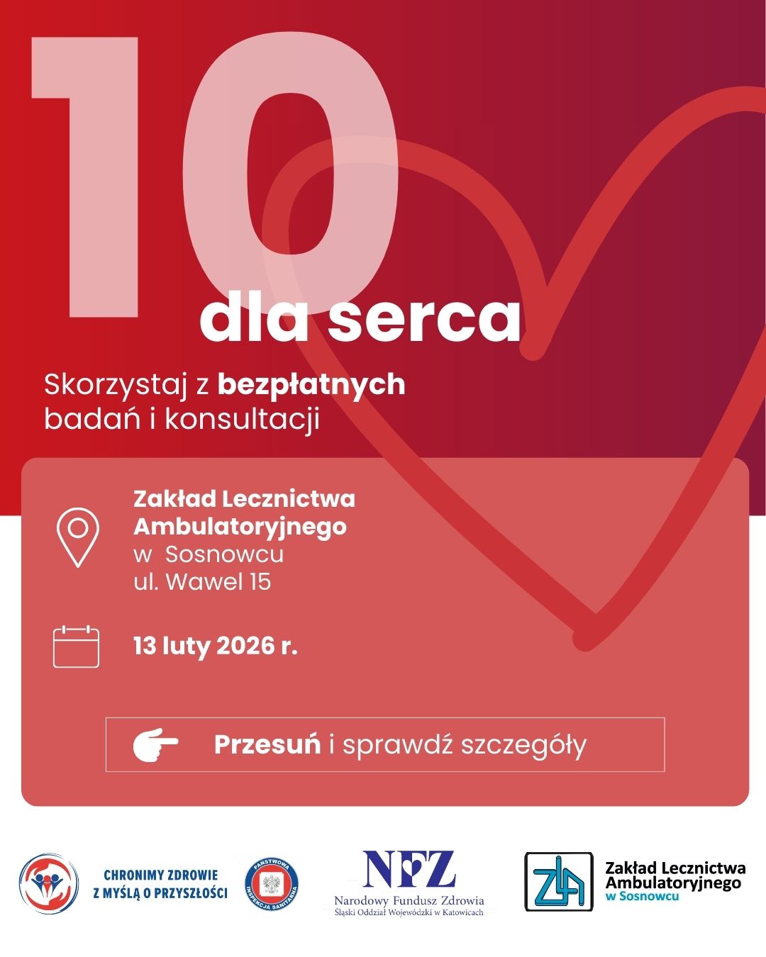 10 dla serca - skorzystaj z bezpłatnych badań i konsultacji - 13.02.2026 w godz. 10.00-13.00 10 dla serca - ZAPRASZAMY 13.02.2026 w godz. 10.00-13.00