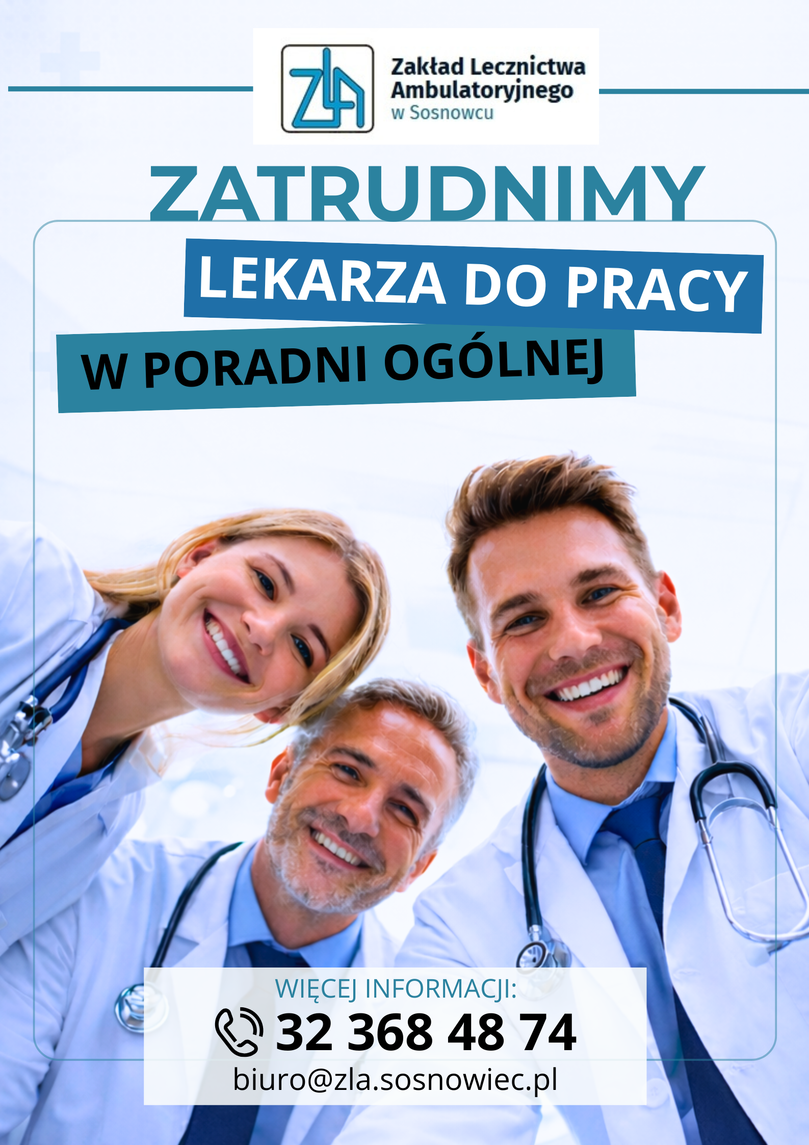 Zakład Lecznictwa Ambulatoryjnego w Sosnowcu zatrudni lekarza na stanowisko w Poradni Ogólnej. Chętnie podejmiemy długofalową współpracę w przyjaznym i dobrze zorganizowanym zespole. Zapraszam do kontaktu osoby zainteresowane pracą w ZLA.
